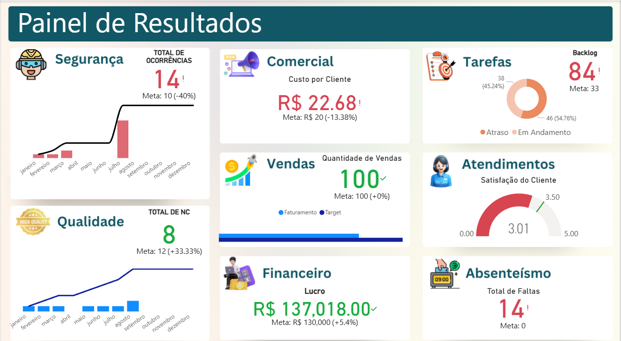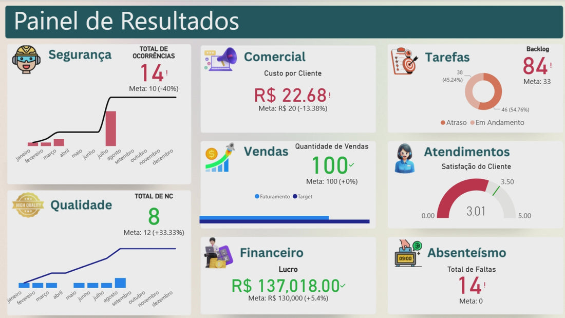 Painel de Resultados Completo entrega uma visão 360º da empresa. Segurança, Qualidade, Marketing, Vendas, Financeiro, Projetos, Atendimento e RH — tudo num só lugar.